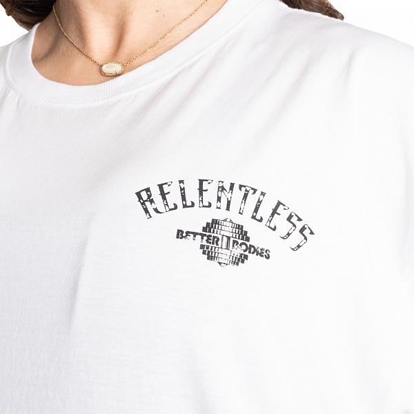 It is made in a soft 100% Cotton fabric that has been washed for a vintage look and feel. There's a small print on the chest and a while the back boasts a large Relentless print as a reminder to be relentless on your fitness journey and in life.