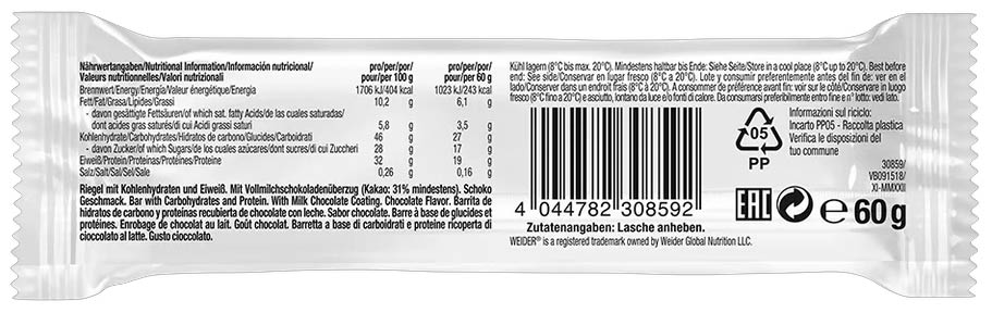 Die athletische Richtlinie der Nahrungszusammensetzung für Bodybuilder besagt, dass mindestens 50% Kohlenhydrate, 30% Eiweiss und max. 20% Fett aufgenommen werden sollen. Dies ist in der Praxis nicht immer einfach. Wer kennt schon die genaue Zusammensetzung aller Lebensmittel? Der 32% Protein Bar ebtspricht dieser Richtlinie und gibt Dir so die Möglichkeit einer einfachen und ausgewogenen Ernährung, die Deinem Trainingsziel entspricht.